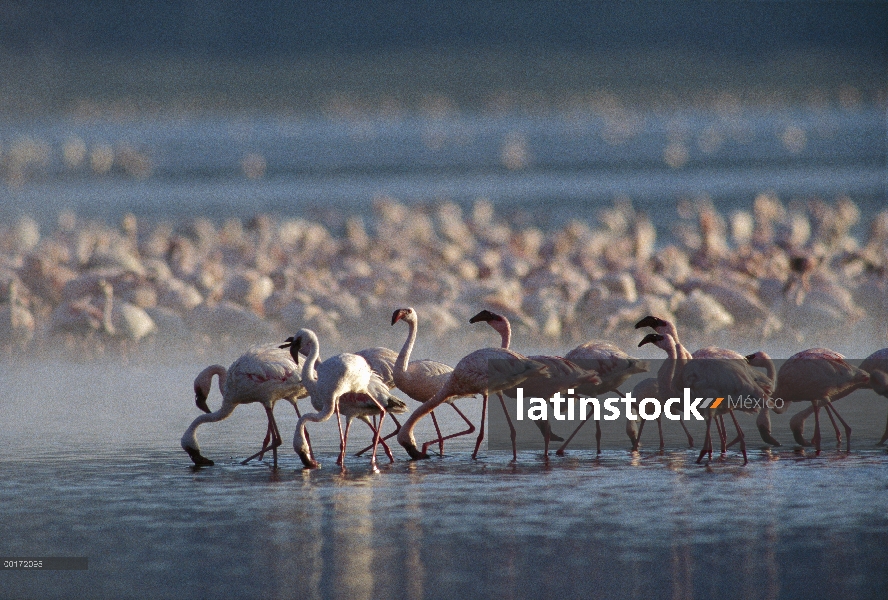 Menor grupo de Flamingo (Phoenicopterus minor) desfilando en una danza de cortejo masa, lago Bogoria