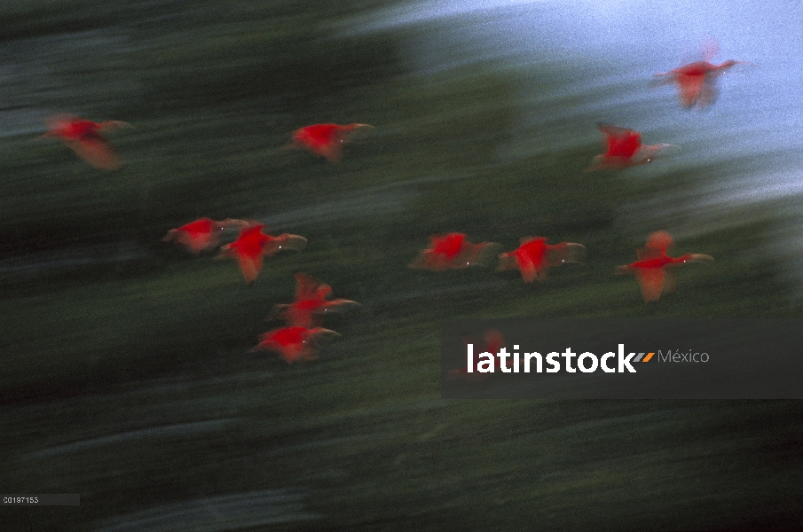 Ibis Escarlata (Eudocimus ruber) acuden volando al gallinero, Trinidad, West Indies